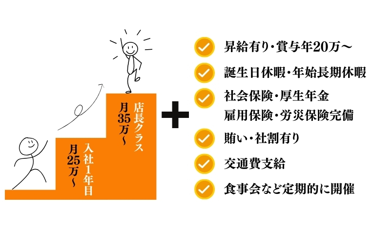 全国の飲食業初任給21万円の相場より4万円も月収アップでスタートできる!!福利厚生も充実していて、もちろん賄いもあるから食費も浮くのが嬉しい♪さらに!給料と別に賞与まで年20万円以上もらえる超ホワイトな待遇☆